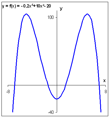 Lösung: von: Ansgar Schiffler Die Funktionsgleichung hat die Form y = f(x) = ax4 + bx² + c 1. Da nur gerade Exponenten auftreten, ist der Graph der Funktion achsensymmetrisch zur y-Achse. 2. c = - 20 bedeutet, dass der Graph die y-Achse bei y = -20 schneidet, also unterhalb der x-Achse. 3. a = - 0,2 < 0 bedeutet, dass der Graph von links unten kommt und nach rechts unten verschwindet. 4. Es stellt sich nun noch die Frage, ob der Graph komplett unterhalb der x-Achse verläuft oder ob er die x-Achse schneidet. Der mittlere Term + 10x² zeigt, dass etwas hinzuaddiert wird. Ist dieser Term groß genug, damit positive Funktionswerte auftreten? Wir machen einfach eine Probe mit x = -4 bzw. x = 4 (das Ergebnis ist aufgrund der Symmetrie das gleiche): f(-4) = f(4) = -0,2 · 44 + 10 · 4² - 20 = - 51,2 + 160 - 20 = + 88,8 Also gibt es auch positive Funktionswerte und der Graph weist somit vier Nullstellen auf. |