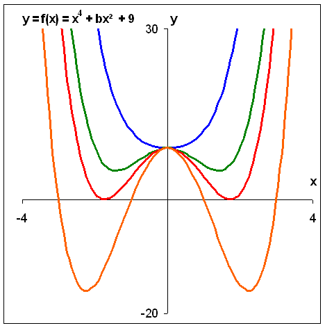 Lösung: von: Ansgar Schiffler b = 2 ; b = -4 ; b = - 6 ; b = -10 Die Funktionsgleichung hat die Form y = f(x) = ax4 + bx² + c 1. Da nur gerade Exponenten auftreten, ist der Graph der Funktion achsensymmetrisch zur y-Achse. 2. c = 9 bedeutet, dass der Graph die y-Achse bei y = 9 schneidet, also oberhalb der x-Achse. 3. a = 1 > 0 bedeutet, dass der Graph von links oben kommt und nach rechts oben verschwindet. 4. b > 0 (hier b = 2) bedeutet, dass alle Funktionswerte größer oder gleich 9 sind, denn es wird zu 9 immer etwas Positives hinzuaddiert. Auch wenn für x negative Werte eingesetzt werden, "verschwindet" das Vorzeichen Minus durch das Quadrieren bzw. durch den Exponenten 4. Der Graph hat also keine Nullstellen. b < 0 Wenn b relativ klein ist, wird der Graph in der Umgebung der y-Achse zwar fallen, aber nie unterhalb der x-Achse liegen. Der Term x4 setzt sich durch, bevor der Graph weit genug fällt. Der Graph hat also keine Nullstellen. In obigem Beispiel ist b = -4. Wenn b relativ groß ist, wird der Graph in der Umgebung der y-Achse so stark fallen, dass er die y-Achse schneidet. Letztendlich wird sich natürlich der Term x4 durchsetzen und der Graph wird wieder ansteigen und somit erneut die x-Achse schneiden. Der Graph hat also vier Nullstellen. In obigem Beispiel ist b = -10 Es gibt auch ein b, für das der Graph die x-Achse lediglich berührt, aber nicht schneidet. Dies ist für b = - 6 der Fall. Der Graph hat dann zwei Nullstellen, genau genommen zwei doppelte Nullstellen. Hinweis: Niemand wird von Ihnen