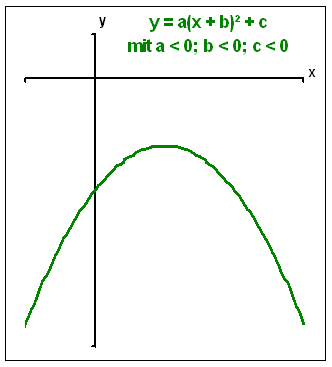 Lösung: von: Ansgar Schiffler Die Funktionsgleichung hat die Form y = f(x) = a(x + b)² + c y = f(x) = a(x + b)² + c ist die Scheitelpunktform der Parabelgleichung. Der Graph dieser Funktion ist eine Parabel. Graphen von Funktionen 2. Grades sind immer Parabeln. 1. a < 0 bedeutet, dass die Parabel nach unten geöffnet ist (Rechtskurve). 2. b < 0 bedeutet, dass die Parabel gegenüber der Normalparabel nach rechts verschoben ist. 3. c < 0 bedeutet, dass die Parabel gegenüber der Normalparabel nach unten verschoben ist. Der Scheitelpunkt der Parabel hat die Koordinaten S(-b|c). Die x-Koordinate des Scheitelpunktes ist x = -b. Beachten Sie bitte, dass dieser Wert positiv ist, denn es gilt ja b < 0. Beispiel: x = -(-2) = + 2. Die y-Koordinate ist x = c. Beachten Sie bitte, dass dies ein negativer Wert ist, denn es gilt ja c < 0. Der Scheitelpunkt der Parabel liegt also im vierten Quadranten. |