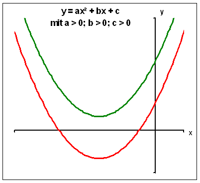 Lösung: von: Ansgar Schiffler Die Funktionsgleichung hat die Form y = f(x) = ax²+ bx + c y = f(x) = ax² + bx + c ist nicht die Scheitelpunktform der Parabelgleichung. Anhand dieser Gleichung lassen sich nicht unmittelbar die Koordinaten des Scheitelpunktes bestimmen. 1. a > 0 bedeutet, dass die Parabel nach oben geöffnet ist (Linkskurve). 2. b > 0 bedeutet, dass die Steigung des Graphen im y-Achsenabschnitt (Schnittpunkt des Graphen mit der y-Achse) positiv ist. 3. c > 0 bedeutet, dass der Graph die y-Achse oberhalb der x-Achse schneidet. Es sind zwei Graphen eingezeichnet, die beide die Bedingung a > 0; b > 0 ; c > 0 erfüllen. Der eine Graph hat keine Nullstellen, sein Scheitelpunkt liegt oberhalb der x-Achse. Der andere Graph hat zwei Nullstellen, sein Scheitelpunkt liegt unterhalb der y-Achse. Eine Möglichkeit festzustellen, ob der Scheitelpunkt oberhalb oder unterhalb der x-Achse liegt, besteht darin, die Funktionsgleichung auf Scheitelpunktform zu bringen. Die Bedingung dafür, dass der Scheitelpunkt oberhalb der x-Achse liegt, lautet: