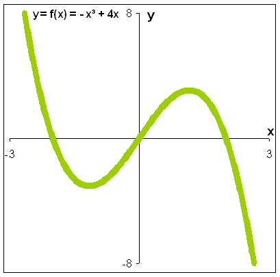 Lösung: von: Ansgar Schiffler Die Funktionsgleichung hat die Form y = f(x) = ax3 + bx 1. Da nur ungerade Exponenten auftreten, ist der Graph der Funktion punktsymmetrisch zum Ursprung. Der Graph verläuft also durch den Ursprung. 2. a < 0 bedeutet, dass der Graph von links oben kommt und nach rechts unten verschwindet. In obigem Beispiel ist a = -1. 3. b > 0 bedeutet, dass die Steigung des Graphen im y-Achsenabschnitt positiv ist. In obigem Beispiel ist b = 4. |