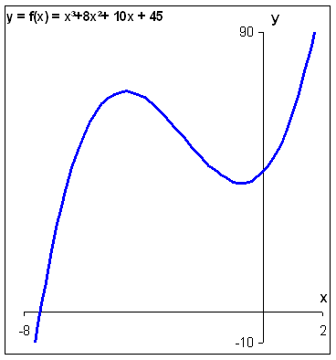 Lösung: von: Ansgar Schiffler Die Funktionsgleichung hat die Form y = f(x) = ax3 + bx² + cx +d 1. d = 45 bedeutet, dass der Graph die y-Achse bei y = 45 schneidet, also oberhalb der x-Achse. 2. a = 1 > 0 bedeutet, dass der Graph von links unten kommt und nach rechts oben verschwindet. 3. b= 8 > 0 bedeutet, dass sich der y-Achsenabschnitt (Schnittpunkt des Graphen mit der y-Achse) in einer Linkskurve (zunehmende Steigung) befindet. Der gesamte Graph besteht nur aus einer Rechtskurve, die im Wendepunkt in eine Linkskurve übergeht. (Funktionen dritten Grades haben immer genau einen Wendepunkt.) 4. c = 10 > 0 bedeutet, dass die Steigung des Graphen im y-Achsenabschnitt positiv ist. Da der y-Achsenabschnitt in einer Linkskurve liegt (siehe 3), muss sich der lokale Tiefpunkt links von der y-Achse befinden. 5. Es stellt sich noch die Frage, ob der lokale Tiefpunkt unterhalb der y-Achse liegt. Wir machen einfach eine Probe mit x = -1 und x = -2. f(-1) = (-1)³ + 8 ·(-1)² + 10 · (-1) + 45 = -1 + 8 - 10 + 45 = 42. f(-2) = (-2)³ + 8 ·(-2)² + 10 · (-2) + 4 5 = -8 + 32 - 20 + 45 = 49. Der Graph nimmt in Richtung negativer x-Werte (wenn wir