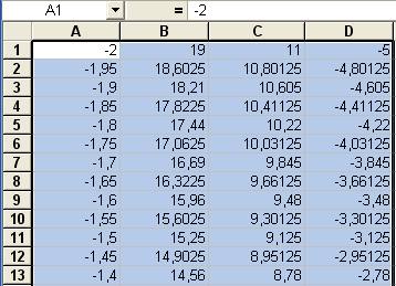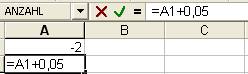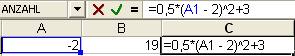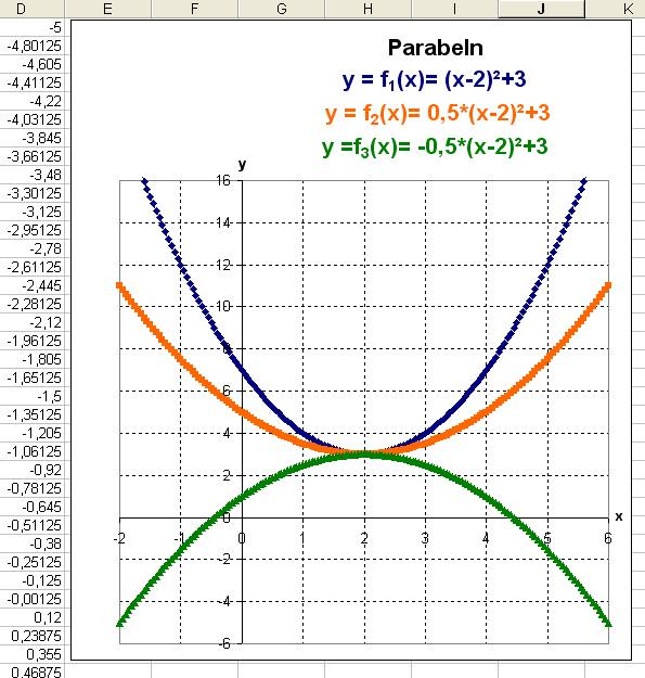 Graphen zeichnen mit Excel von: Ansgar Schiffler, 2005 zurück zu 'Ganzrationale Funktionen' Angenommen Sie möchten die Graphen der drei Parabeln mit den Funktionsgleichungen y = f1(x)= (x - 2)² + 3 und y = f2(x)= 0,5*(x - 2)² + 3 und y =f3(x)= -0,5*(x - 2)² + 3 zeichnen. Sie haben hierzu verschiedene Möglichkeiten. 1. Sie fertigen eine Wertetabelle an, zeichnen ein Koordinatensystem und zeichnen dann die drei Graphen ein. Nachteil: Sie müssen viel Zeit investieren. 2. Sie kaufen sich einen graphischen Taschenrechner oder ein Programm zum Zeichnen von Graphen. Nachteil: Sie müssen Geld investieren und die richtige Bedienung Ihres Programms bzw. Ihres Taschenrechners erst einmal erlernen. 3. Sie setzen sich an einen PC, rufen Excel auf und in wenigen Schritten haben Sie schon die Graphen gezeichnet. Wie das funktioniert, wird Ihnen hier erklärt. 1. Schritt: Sie überlegen sich, von wo bis wo die x-Achse reichen soll. Wir nehmen an, Sie möchten den Bereich von x = -2 bis x = 6 darstellen. Dann tragen Sie in das erste Feld die Zahl -2 ein und in das darunter liegende Feld tragen Sie die 'Formel' =A1 + 0,05 ein. (siehe Bild). Dann kopieren Sie dieses Feld in die nächsten 159 darunter liegende Felder (A3 bis A161). Jetzt stehen in den Felder die Werte -2 ; -1,95; -1,90; ...... ; 5,95; 6. Für alle diese 161 x-Werte werden später die zugehörigen y-Werte errechnet. 2. Schritt: Sie tragen in das Feld B1 die Formel ein zur Errechnung der y-Werte der ersten Parabel und entsprechend in das Feld C1 die Formel zur Errechnung der y-Werte der zweiten Parabel. Siehe hierzu das Bild. Hinweis: Das Zeichen ^ befindet sich auf Ihrer Tastatur links oben unterhalb der ESC-Taste und wird erst dann auf dem Bildschirm sichtbar, wenn Sie das nächste Zeichen eingegeben haben. Wenn Sie alle drei Formeln in die Felder B1, C1 und D1 eingegeben haben, markieren Sie diese drei Felder und kopieren sie in die 159 darunter liegenden Zeilen.. Hinweis: Sobald Sie die Formel komplett eingegeben haben und die Return-Taste betätigen, sehen Sie in dem Feld nicht mehr Ihre Formel, sondern das Ergebnis der Berechnung. Daher sehen Sie in obigem Bild auch im Feld B1 die Zahl 19 und nicht die Formel = (A1 - 2)^2+3, denn wenn Sie den Wert A1 = -2 einsetzen in diese Formel erhalten Sie als Ergebnis die Zahl 19. 3. Schritt: Sie markieren alle vier Spalten (erste Spalte: x-Werte, die nächsten drei Spalten die y-Werte für die drei Parabeln) und die 161 Zeilen. (siehe Bild).