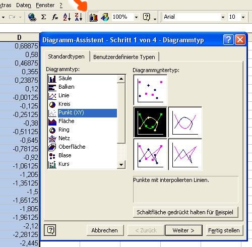 4. Schritt: Sie rufen den Diagramm-Assistenten auf (siehe Bild, roter Pfeil) und wählen die im Bild dargestellten Optionen. 5. Schritt: Sie klicken immer auf 'Weiter' und wählen im Schritt 3 als Diagrammtitel 'Parabeln' und für Beschriftung der x-Achse 'x' und für Beschriftung der y-Achse 'y'. Sie erhalten dann ein Diagramm, auf dem die Parabeln zu sehen sind. Allerdings können Sie nun das Aussehen Ihres Diagramms noch verbessern, indem Sie z.B. die x-Achse anklicken und eine Skalierung von -2 bis +6 in 1er-Schritten wählen. Genauso können Sie die Farben wählen (die Farbe der Graphen wird gewählt, indem Sie mit dem Cursor auf den Graphen gehen und dann doppeltklicken) und sich Hilfsgitternetzlinien anzeigen lassen. Dies ist nicht kompliziert, erfordert nur je nach Geschicklichkeit und PC-Erfahrung unter Umständen etwas Geduld. Das Ergebnis könnte dann so aussehen: