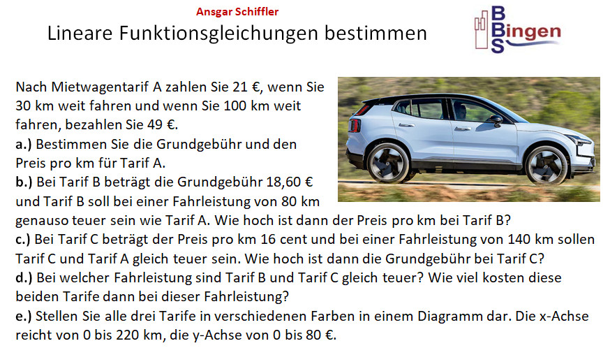 a.) Erstelle für alle drei Tarife eine Wertetabelle von 0 bis 200 km in 50-km-Schritten. b.) Stelle alle Tarife für 0 bis 200km Fahrleistung graphisch in drei unterschiedlichen Farben in einem Diagramm dar. c.) Stelle für alle drei Tarife die zugehörige Gleichung auf. d.) Bestimme graphisch und rechnerisch, welcher Tarif bei welchen Fahrleistungen am günstigsten ist.