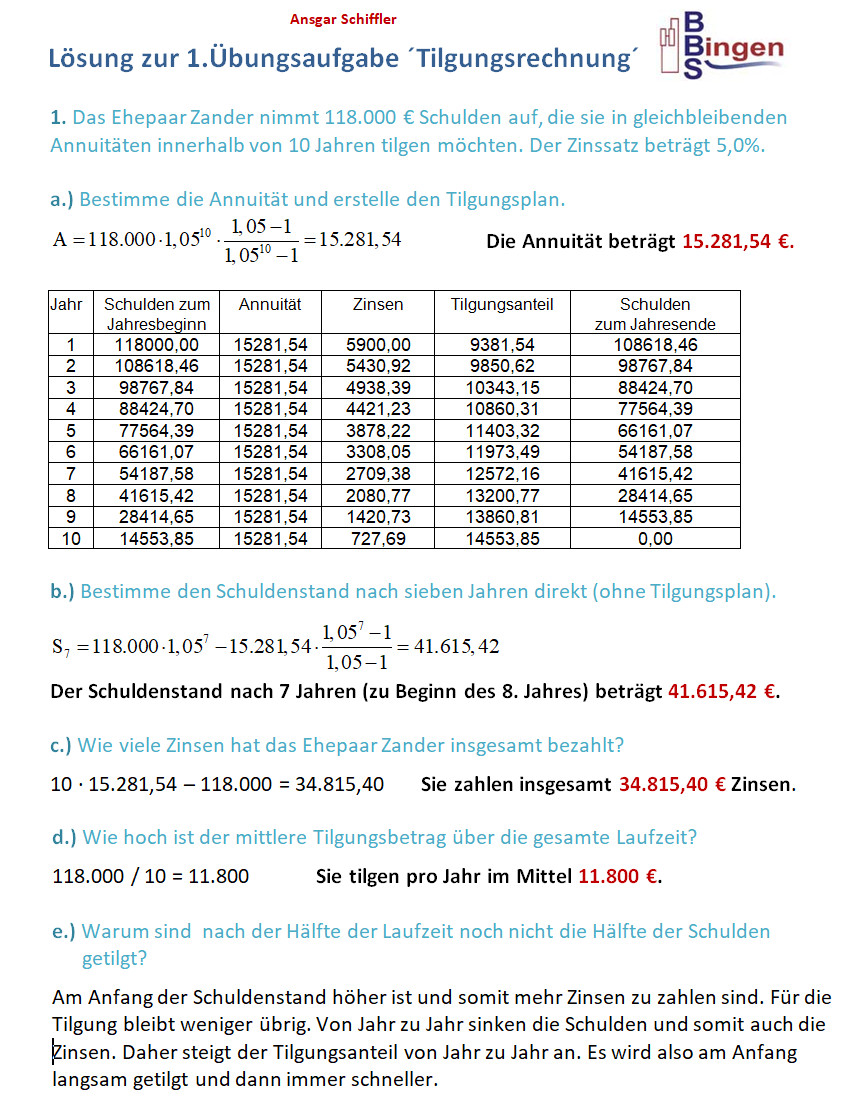 zurück zu den Aufgaben Tilgungsrechnung