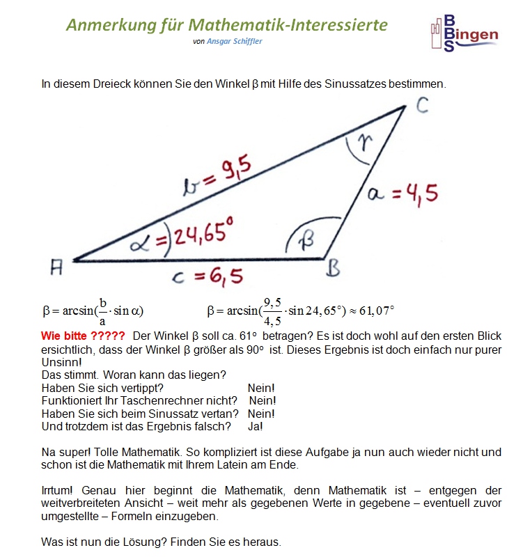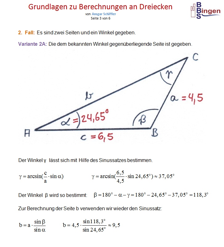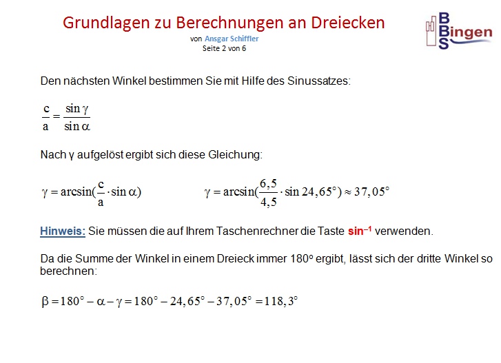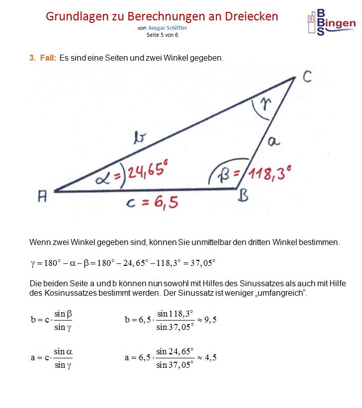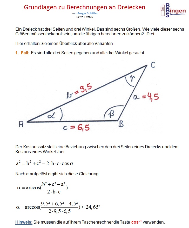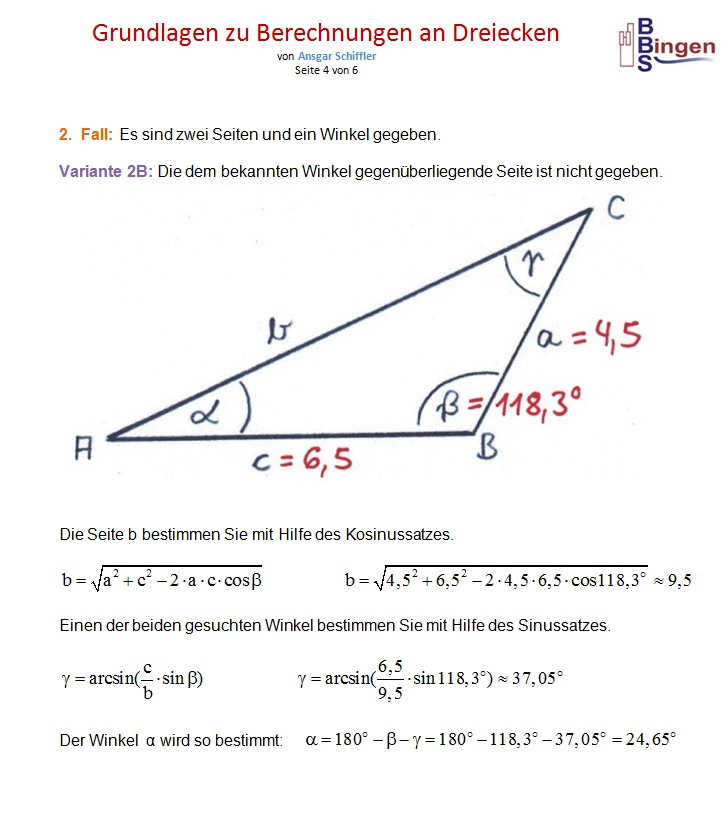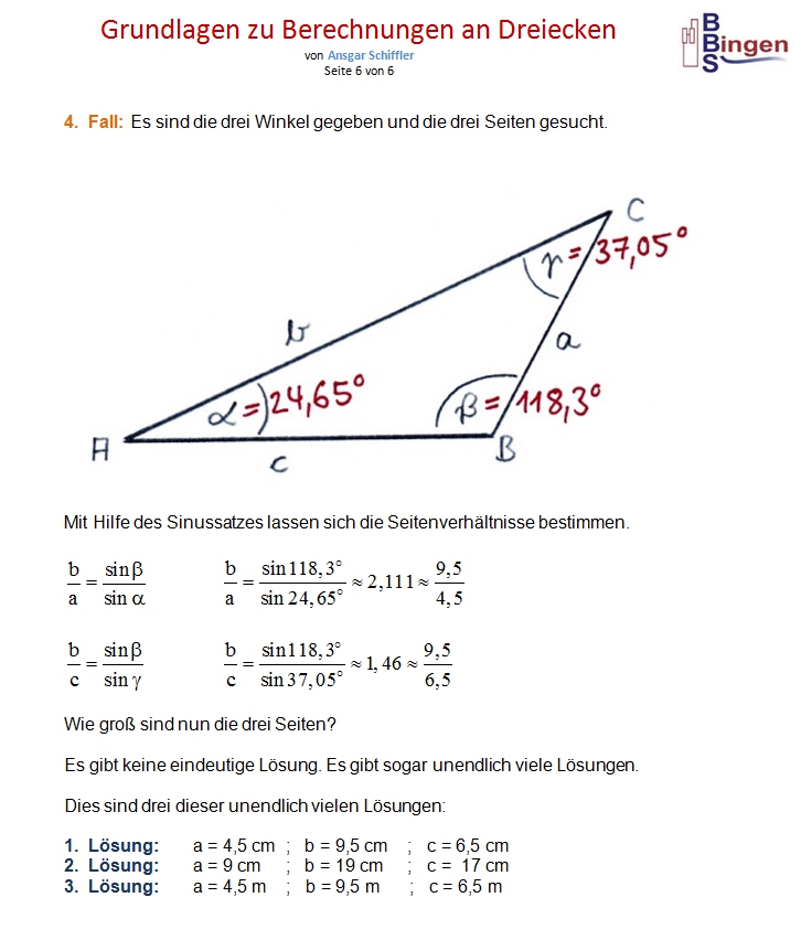 Anmerkung: Ich habe darauf geachtet, für das Dreieck möglichst einfache Werte zu wählen. Wenn ich die Seiten a = 4,5 ; b = 9,5 ; c = 6,5 vorgebe, ergeben sich diese Winkel: α ≈ 24,645o ; β ≈ 118,318o ; γ ≈ 37,037o Wenn ich die Winkel α ≈ 24,65o ; β ≈ 118,3o ; γ ≈ 37,05o vorgebe, ergeben sich diese Seiten: a = 4,5 ; b ≈ 9,4999 ; c ≈ 6,5008 oder a ≈ 4,5001 ; b = 9,5 ; c ≈ 6,5009 oder a ≈ 4,4995 ; b ≈ 9,4987 ; c = 6,5 Ich habe einfach zugunsten der Übersichtlichkeit ein wenig gerundet, damit Sie nicht mit so vielen Nachkommastellen rechnen müssen. Das ist der Grund dafür, dass ich bei obigen Aufgaben an manchen Stellen ´vorsätzlich´ minimale Rundungsfehler in der Größenordnung von einem hundertstel Grad gemacht habe. |