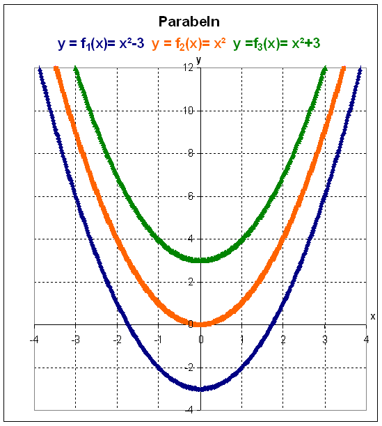 Das erste Bild zeigt die Normalparabel (Farbe Orange) sowie zwei Parabeln, die gegenüber der Normalparabel in y-Richtung (senkrechter Richtung) verschoben sind. So ist die zu der Funktionsgleichung y = f3(x) = x² + 3 gehörende Parabel gegenüber der Normalparabel um 3 Einheiten nach oben verschoben.