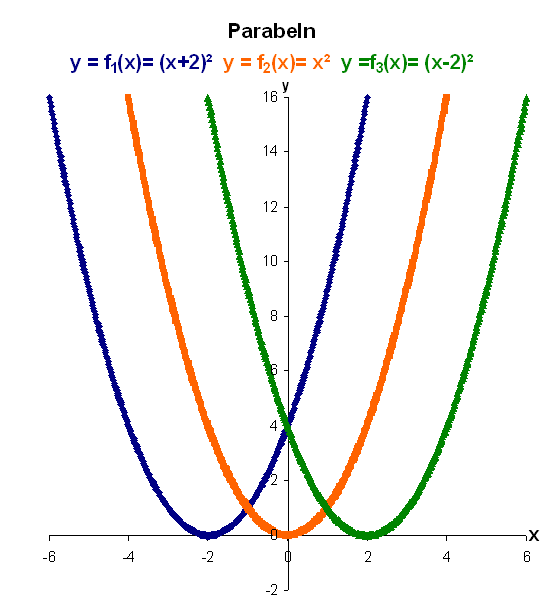 Bild 1: Verschiebung der Parabel in senkrechter Richtung. Das zweite Bild zeigt die Normalparabel (Farbe Orange) sowie zwei Parabeln, die gegenüber der Normalparabel in x-Richtung (waagrechter Richtung) verschoben sind. So ist die zu der Funktionsgleichung y = f3(x) = (x -2)² gehörende Parabel gegenüber der Normalparabel um 2 Einheiten nach rechts verschoben. zurück zu 'quadratische Funktionen'